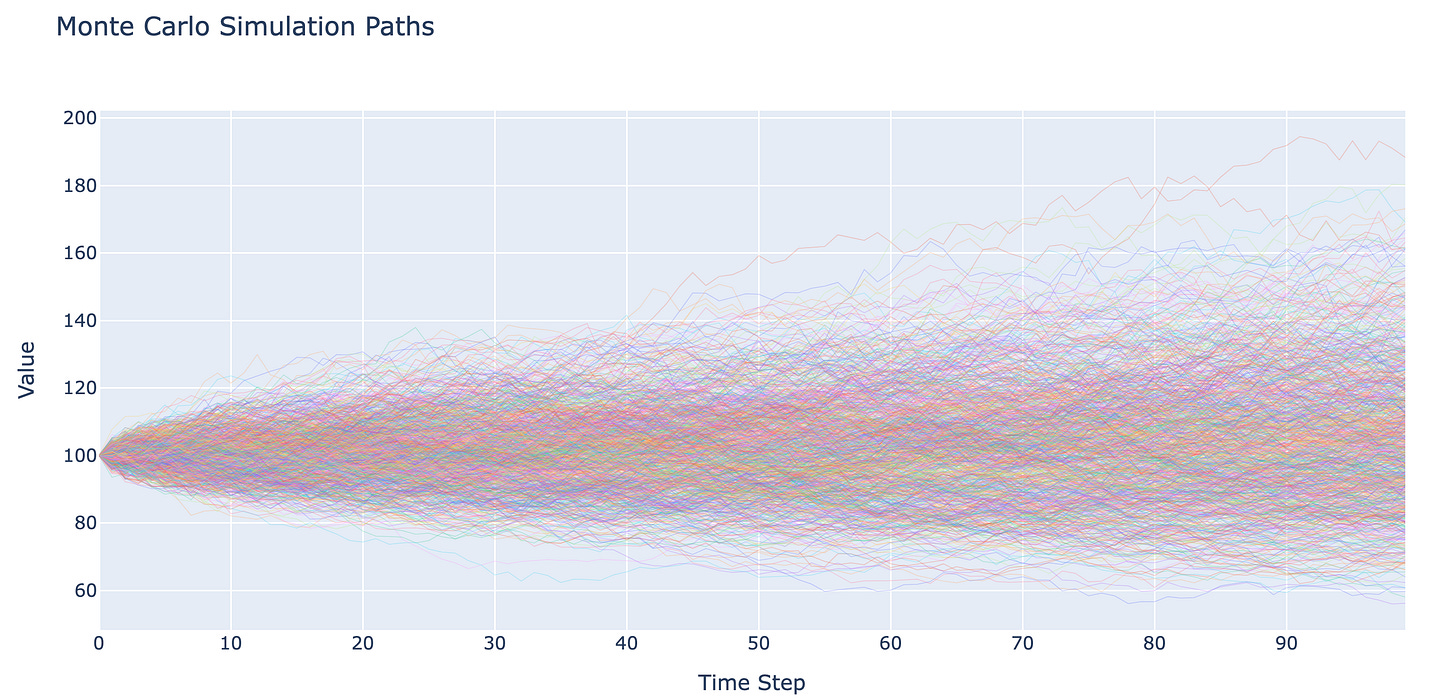After constructing the optimal portfolio, we perform Monte Carlo simulations to explore different future scenarios for portfolio value. We simulate 1,000 different paths for the portfolio value over a 1-year time horizon.