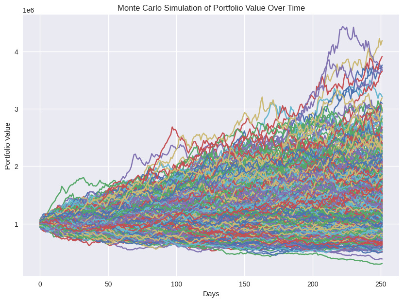 portfolio_simulations = monte_carlo_portfolio_simulation(start_price=1000000, daily_mean_returns.values, daily_cov_matrix.values, max_sharpe['x'], num_simulations=1000, time_horizon=252)